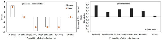 Finally, the variation trends and their sustainability of county proportions with different disaster losses are thoroughly examined (Figure 12). It can be shown that the county proportions with slight and slight-medium yield reduction tend to increase (Z > 0), especially those with slight yield loss displaying a significant increase (Z > 1.64). However, the county percentage with medium, medium-severe, and severe yield reductions, as well as the total yield reduction, all present a decreasing trend (Z < 0), especially those with medium and severe yield loss showing an extremely significant decrease (Z < −2.32) and those with medium-severe yield loss having a significant decreasing trend (Z < −1.64).