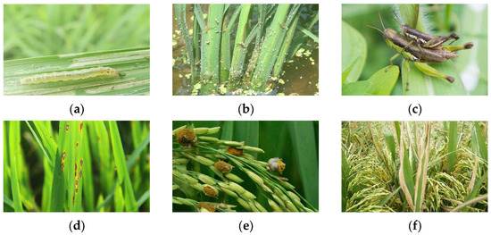 Image samples in the dataset. (a) Rice borer; (b) rice planthopper; (c) rice locust; (d) rice blast; (e) rice false smut; (f) bacterial leaf blight.