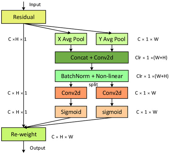 Adding attention mechanisms to neural networks is an efficient method for improving their feature extraction capabilities. One such mechanism is the coordinate attention (CA) module proposed by Hou et al. [24]. This module is highly flexible and can be easily integrated with various classic network structures to improve the feature extraction capabilities of the network.