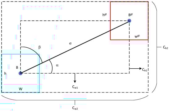 In Equation (3), Λ is the angle loss function, where σ represents the center point distance between the predicted box and the ground truth box, and are the center point coordinates of the ground truth box, and and are the center point coordinates of the predicted box. Δ is the distance loss function, in which Cw2 and Ch2 represent the width and height of the bounding box that encompasses both the ground truth and predicted boxes. Ω denotes the shape loss function, where , , , and denote the width and height of the ground truth and predicted boxes, respectively.