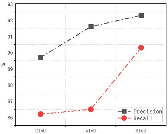 In this experiment of training the MobileNet-CA-YOLO network for rice disease and pest detection, we compared the SIoU, CIoU, and WIoU loss functions, and the results are shown in Table 6. The comparison of precision and recall under different loss functions is shown in Figure 8.