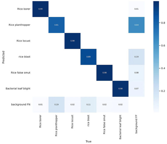 Based on the analysis of the confusion matrix, in this experiment, rice diseases and pests were divided into six categories, including three pests: rice borer, rice planthopper, and rice locust, and three diseases: rice blast, rice false smut, and bacterial leaf blight. Taking rice blast as an example, it can be observed that the model achieved a classification accuracy of 89% for rice blast. The false negative rate, which represents the rate at which rice blast was incorrectly predicted as the background, was 11%. The false positive rate, indicating the rate at which the background was mistakenly identified as rice blast, was 19%. Analyzing Table 6, it can be seen that the model performed best in identifying rice borer and rice locust, with accuracies of 95.8% and 98.3%, respectively. However, the recognition accuracy for rice planthopper was slightly lower at 78.2%.