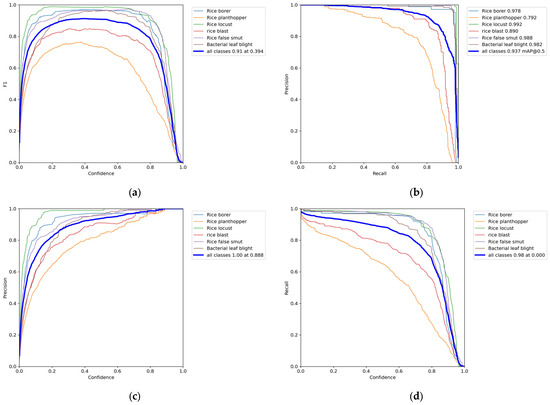 In this experiment of training rice diseases and pests using the MobileNet-CA-YOLO network, the F1_curve, PR_curve, P_curve, and R_curve during the model training process are shown in Figure 10.