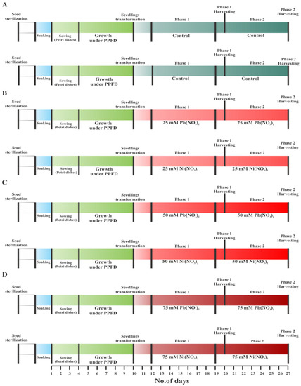 Figure 1. Graphical representation of methodology and treatments followed to conduct the current study for better understanding. (A) control conditions (without Pb and Ni stress), (B) stress conditions at 25 mM of Pb and Ni, (C) stress conditions at 50 mM Pb and Ni, and (D) stress conditions at 75 mM of Pb and Ni.