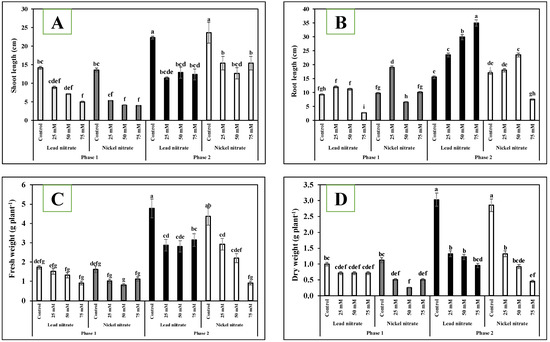Figure 2. Effect of different Pb and Ni concentration levels on (A) shoot length (cm), (B) root length (cm), (C) fresh weight (g plant−1) and (D) dry weight (g plant−1) in two phases. The means with the same letters are not significantly different at p < 0.05.
