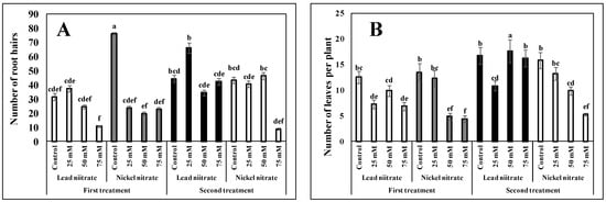 Figure 3. Effect of different Pb and Ni concentration levels on (A) number of root hairs, and (B) number of leaves per plant in two phases. The means with the same letters are not significantly different at p < 0.05.
