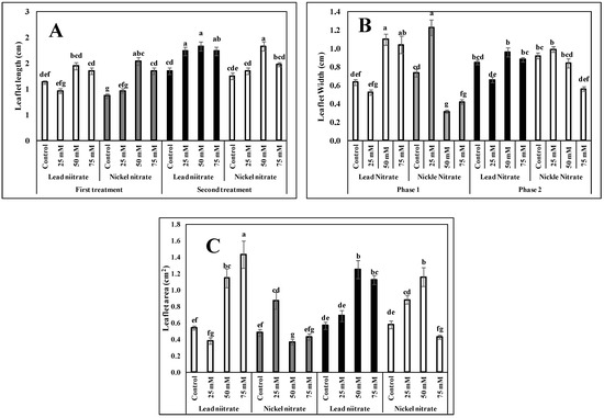 Figure 4. Effect of different Pb and Ni concentration levels on (A) leaflet length (cm), (B) leaflet width (cm) and (C) leaflet area (cm2) in two phases. The means with the same letters are not significantly different at p < 0.05.