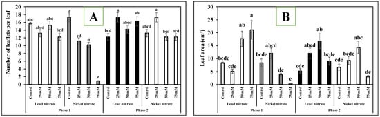 Figure 5. Effect of different Pb and Ni concentration levels on (A) number of leaflets per leaf, and (B) leaflet area (cm2) in two phases. The means with the same letters are not significantly different at p < 0.05.