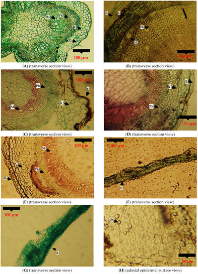Figure 6. Effect of different levels of Pb or Ni stress on anatomical structures of albizia lebbeck. (A) Root anatomical structure under 0 mM, (B) root anatomical structure under 50 mM Pb, (C) root anatomical structure under 75 mM Ni, (D) stem anatomical structure under 75 mM Ni (E) stem anatomical structure under 75 mM Pb, (F) leaf anatomical structure under 75 mM Pb, (G) leaf anatomical structure under 50 mM Ni and (H) leaf adaxial anatomical structure under 75 mM Ni. Abbreviations; M (metaxylem), Ph (phloem), C (cortical), E (epidermal) and St (stomata).