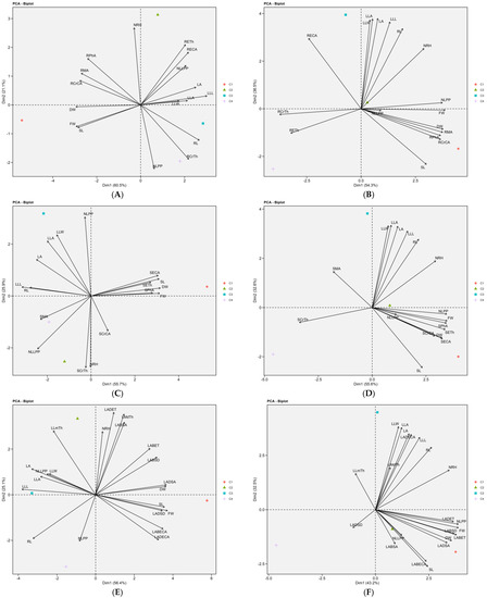Figure 7. PCA-biplot of morphological traits with (A) root anatomical traits under Pb stress, (B) root anatomical traits under Ni stress, (C) stem anatomical traits under Pb stress, (D) stem anatomical traits under Ni stress, (E) leaf anatomical traits under Pb stress and (F) leaf anatomical traits under Ni stress.