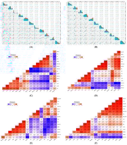 Figure 8. Correlation analysis of morphological traits with (A) morphological traits under Pb stress, (B) morphological traits under Ni stress, (C) root anatomical traits under Pb stress, (D) root anatomical traits under Ni stress, (E) stem anatomical traits under Pb stress and (F) stem anatomical traits under Ni stress. The *, **, and *** indicate significance at p < 0.05, p < 0.01 and p < 0.001, respectively.