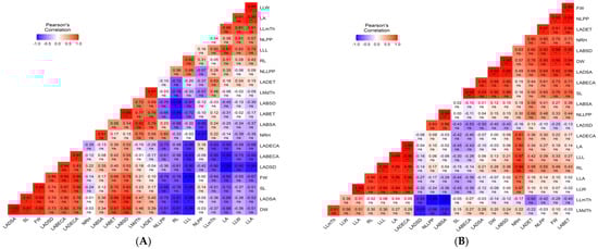 Figure 9. Correlation analysis of morphological traits with (A) leaf anatomical traits under Pb stress and (B) leaf anatomical traits under Ni stress. The *, **, and *** indicate significance at p < 0.05, p < 0.01 and p < 0.001, respectively.