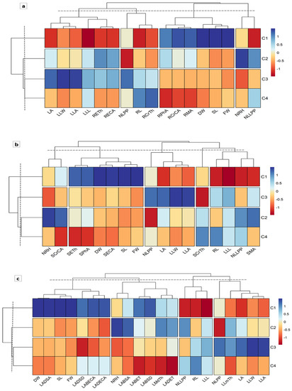 Figure 10. Cluster heatmaps showing grouping of morphological traits with (a) root anatomical, (b) stem anatomical and (c) leaf anatomical traits under Pb stress.