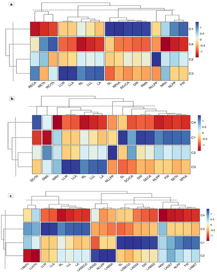 Figure 11. Cluster heatmaps showing grouping of morphological traits with (a) root anatomical, (b) stem anatomical and (c) leaf anatomical traits under Ni stress.