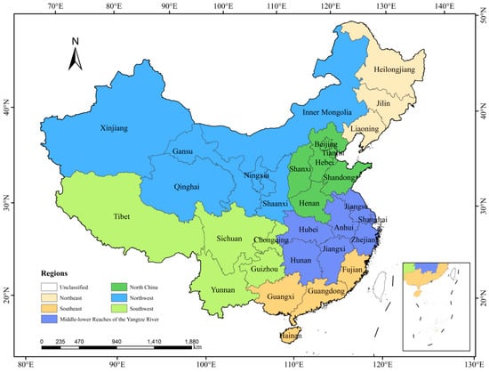 According to the main grain-producing areas in China, 31 provinces were divided into six regions [20]: Northeast, North China, Middle-lower Reaches of the Yangtze River, Northwest, Southwest and Southeast (Figure 1). Data for Hong Kong, Macao and Taiwan are not included in this paper.