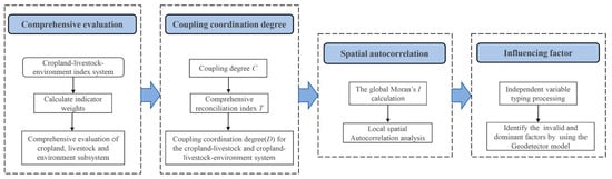 To explore the coupling relationship between cropland and livestock in China in the past two decades, we constructed a research framework consisting of four processes (Figure 2). The comprehensive evaluation of cropland–livestock systems and cropland–livestock–environment systems included the construction of an index system, weight calculation and comprehensive evaluation. In the coupling coordination degree model, the coupling degree (C), comprehensive reconciliation index (T) and coupling coordination degree (D) of cropland–livestock and cropland–livestock–environment systems were calculated. The spatial autocorrelation analysis of coupling coordination degree included calculating global Moran’s I and local spatial autocorrelation analysis. The main influencing factors and the degree of coupling coordination degree were explored using the Geographical detector model.
