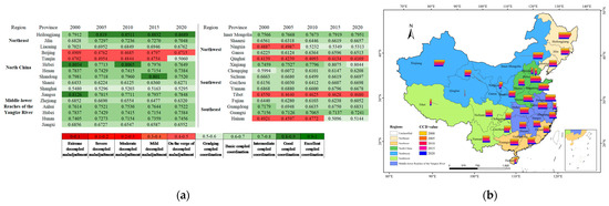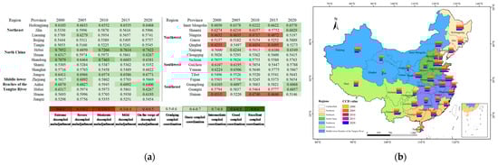 The coupling coordination degree for the cropland–livestock–environment system in 31 provinces of China from 2000 to 2020. (a): the coupling coordination degree values for the cropland–livestock–environment system in 31 provinces; (b): the spatial distribution of the coupling coordination degree.