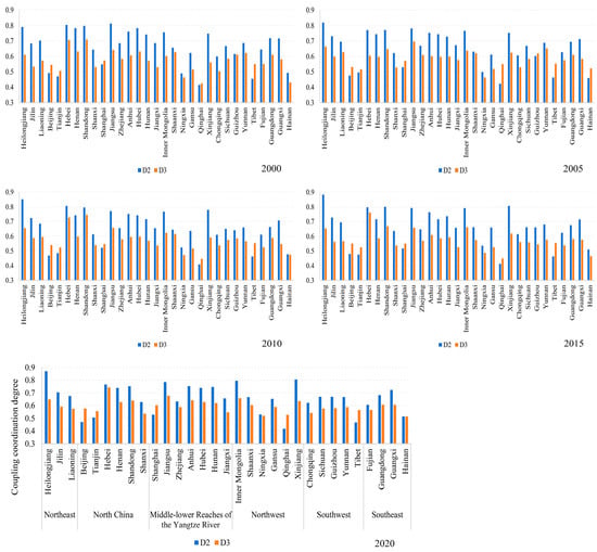 Coupling coordination degree comparison of cropland and livestock system in 31 provinces of China from 2000 to 2020.