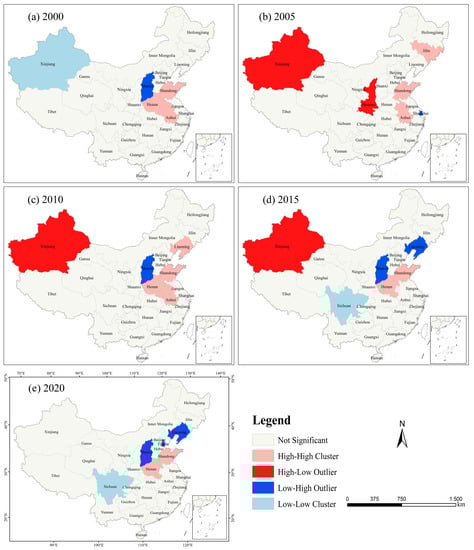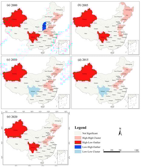 Global Moran’s I was used to determine the global spatial autocorrelation of the coupling coordination degree for the cropland–livestock and cropland–livestock–environment systems. The global Moran’s I p values of the coupling coordination degree for cropland–livestock and cropland–livestock–environment systems in 2000 were below 0.1, and the Z values were over 1.65, and in 2010, the p value of the coupling coordination degree for the cropland–livestock–environment system was below 0.05, and the Z value was over 1.96, indicating a significant spatial positive correlation (Table 3). Nevertheless, in other years the p values were all over 0.1, and the Z values below 1.65, indicating that there was no spatial correlation.