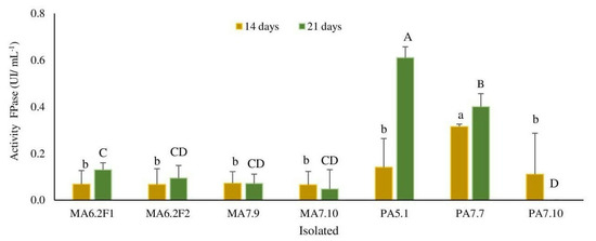 Average of enzymatic activities of the total cellulase (FPase) after 14 days and 21 days of culture, expressed in UI mL −1. MA: fungi isolated from horse bed compost made with shavings; PA: fungi isolated from horse bed compost made with rice straw. Lower-case letters compare the enzymatic activity of the isolates after an incubation period of 14 days. Capital letters compare the enzymatic activity of cellulase of the isolates after an incubation period of 21 days. Different letters indicate differences according to Student’s t test at 1% probability.