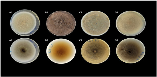 Macromorphological characteristics of the selected fungi. (A) MA7.9; (B) PA5.1; (C) MA6.F1; (D) PA7.7. The plates were photographed from the top (1) and bottom (2).