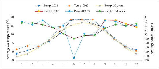 Monthly average air temperature and precipitation for 2021, 2022, and 30 years at the experimental location.