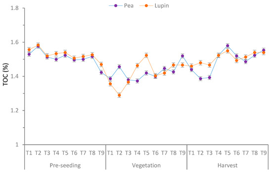 In general, the stages had statistically significant effects on the TOC (p < 0.05) (Figure 2) in both crops. Overall, the TOC in pea appeared with an average of 1.52a, 1.49a, and 1.41b for the pre-seeding, harvesting, and vegetation stages, respectively. The averages for lupin were 1.54a, 1.50a, and 1.42b TOC for the pre-seeding, harvesting, and vegetation stages, respectively. The treatment with the highest TOC during pre-seeding was T2, TOC = 1.58; harvesting T5, TOC = 1.55; and vegetation T5, TOC = 1.52. In addition, in lupin, the treatments with the highest TOC during pre-seeding were T2, TOC = 1.58; harvesting T5, TOC = 1.58; and vegetation T9, TOC = 1.52.