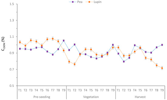 The results also showed that the treatments had a significant effect (p < 0.05) on the labile fraction of soil organic matter (CLSOM) in pea, with an average of 0.87a, 0.87a, 0.90ab, 0.89ab, and 0.89a CLSOM for T2, T4, T6, T7, and T8, respectively (Figure 3). The lowest CLSOM recorded during the harvest was T2, CLSOM = 0.79; pre-seeding T7, CLSOM = 0.88; and vegetation T6, CLSOM = 0.83. The stages also had a significant effect on CLSOM in lupin, with an average of 1.03b, 0.88a, 0.87a CLSOM for the pre-seeing, harvesting, and vegetation stages, respectively. The lowest CLSOM recorded during harvest was T9, CLSOM = 0.71; pre-seeding T5, CLSOM = 0.99; and vegetation T2, CLSOM = 0.76.