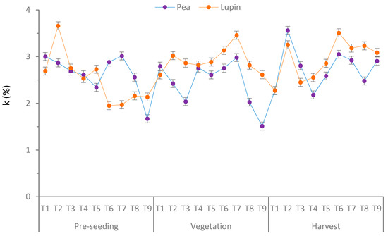 In pea, treatments significantly affected the oxidation reaction rate constant of soil organic matter (k) (p < 0.05), with an average of 3.11b, 3.01ab, 2.96ab, 2.87ab, and 2.59abd k for T2, T7, T8, T3, and T5, respectively (Figure 4). The highest oxidation reaction rate constant (k) recorded during the harvesting stage was T2, k = 3.56; vegetation T7, k = 2.97; and pre-seeding T7, k = 3.01, while in lupin, the highest k was obtained with values of 3.65 (T2), 3.45 (T7), and 3.51 (T6), respectively, for the pre-seeding, vegetation, and harvesting stages.