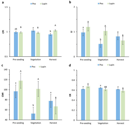 As shown in Figure 5, the highest CPI in pea was obtained from the pre-seeding and vegetation stages, with a value of approximately 1.01 without significant difference from each other. However, the harvesting stage in lupin showed the highest CPI, significantly higher than the two other stages. Regarding LI, the pre-seeding stage had the highest amounts in pea and lupin crops (0.97 and 1.19, respectively). Similar to LI, the highest values for CPI were also obtained in pre-seeding in both crops. The treatments and stages showed different effects on the enrichment ratio (ER) in pea; however, they were not statistically significant. In lupin, the ER was statistically different at the three stages (p < 0.05): pre-sowing (0.67b), vegetation (0.66a), and harvesting (0.58a).