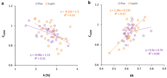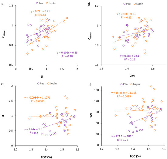 Regression analyses were then performed to determine whether there was a significant correlation between the change in the SOM pool and these selected indicators (Table 2 and Figure 6). Apart from the lability index and the carbon management index that showed a positive correlation with TOC in pea, the rest of the indicators did not correlate with the total organic carbon in either crop, while the labile fraction of soil organic matter was correlated with all these indicators in both crops. This shows the ability of CLSOM to predict SOM dynamics in general. For both crops, k was negatively correlated with CLSOM, showing that the increase in the oxidation rate constant reduced the labile fraction of soil organic matter (Kopecký et al., 2021). The rest of the indicators showed a positive correlation with CLSOM in both crops, indicating that the increase in the lability index, carbon management index, and carbon enrichment ratio resulted in an increased labile fraction of soil organic matter. There was a significant correlation between the change in the selected indicators and the changes in the carbon stocks. These indicators were studied and confirmed to be useful in evaluating the soil organic matter dynamics in different agricultural systems by various other researchers [45,48,54,60,112,113,114].