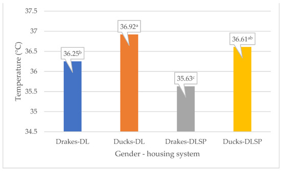 The significant interaction (p < 0.001) between gender and housing system for external body temperature in 13-week-old Muscovy ducks. Values marked with different superscript letters in each column are significantly different (p ≤ 0.05).