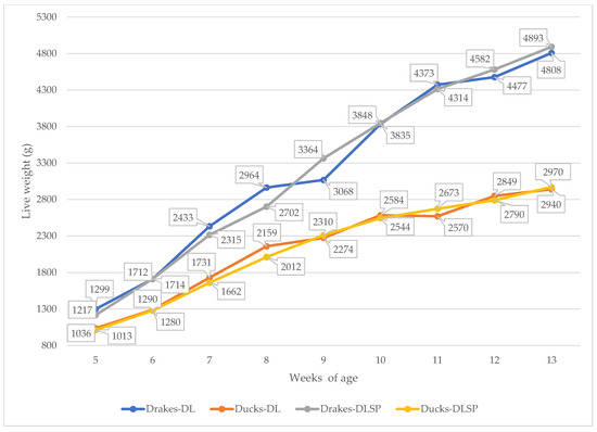 The results of productive performance and growth performance are displayed in Table 4 and Figure 3. Table 5 shows the results of selected carcass traits. According to the live weight of birds at 5 weeks of age (start of the experiment), the significant differences between the DLSP and DL groups are caused by sexual dimorphism between drakes and ducks because the live weight of the groups was counted as an average. Figure 3 shows that groups were created based on similar weight. Birds from the DLSP group had significantly higher live weight (p < 0.001) at the end of the experimental period, higher average daily weight gain (p < 0.001), lower feed consumption (p < 0.001), and lower feed conversion ratio (p < 0.001). All selected parameters were significantly higher for drakes than for ducks. However, the productive traits differed significantly between the groups, and were not reflected in most of the monitored carcass traits. A higher value (p < 0.05) of the AF proportion from SEW was found in DL birds compared with DLSP birds. In addition, the breast meat was significantly affected by housing conditions (p < 0.05) in the DL birds compared with the DLSP birds. As expected, drakes had a significantly higher SW (p < 0.001), SEW (p < 0.001), and EW (p < 0.001) than ducks. Furthermore, drakes were characterized by higher DoP (p < 0.001) and higher (p < 0.05) thigh proportions compared with ducks. However, ducks had a higher wing (p < 0.001) and breast (p < 0.001) proportion compared with drakes.