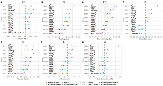 Variation in the means and 95% confidence intervals for different rice traits. (A) grain yield (GY), (B) plant height (PH), (C) days to flowering (DTF), (D) panicle blast (Pb),(E) brown spots (BP), (F) leaf scald (Ls) and (G) grain discoloration (Gd). ns Non-significant; * and ** significant by the t-test at the 0.05 and 0.01 probability levels, respectively; R: replicates; B(R): block within replicates; GRP: group; : general combining ability of the parental group of commercial rice cultivars; : general combining ability of the parental group of progenies of the CNA 12T population; : specific combining ability; : parental group of commercial rice cultivars; : parental group of progenies of the CNA 12T population; : checks; : group of crosses with IRGA 424; : group of crosses with BRS Biguá; : group of crosses with BRS Catiana; : group of crosses with Federarroz 50; : group of crosses with Epagri 106; CV: coefficient of variation. Means followed by the same letter do not differ statistically according to the Tukey test (p-value 0.05). Dashed lines represent the mean (progenies, checks, parents, and crosses) of each measured trait.