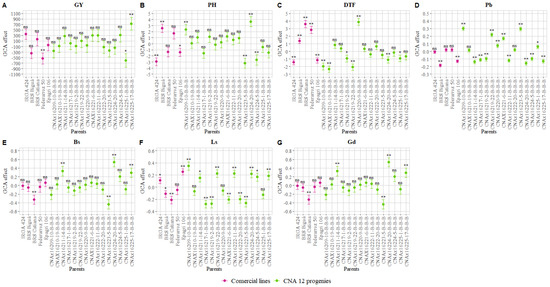 The magnitude and direction of effects, as shown in Figure 2, can provide guidelines for selecting parents and allowing their use by breeders [46,47]. The effects revealed that none of the parents were good combiners for all traits measured simultaneously. The estimate showed that the best combining parent to improve the GY was CNAx16225-17-B-B-B (Figure 2A). Besides, we found a low, negative, and highly significant estimate ( ≤ 0.01) for Pb (Figure 2D), indicating that this parent could increase the resistance to panicle blast. On the other hand, using CNAx16225-17-B-B-B in hybridization can increase rice susceptibility to Bs, Ls, and Gd (Figure 2E–G).