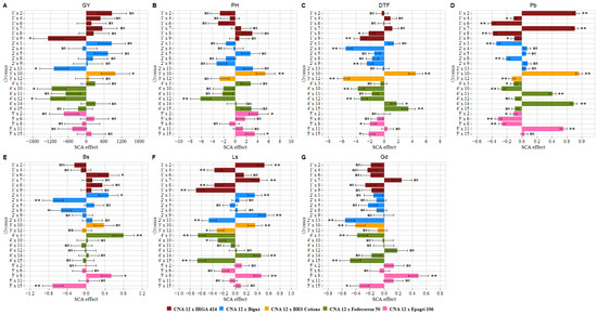 Among the 25 crosses, the 3’ × 10 cross (994 Kg ha−1) showed positive and highly significant effects for GY (Figure 3A). Furthermore, this cross showed negative and significant values for Gd (Figure 3G). On the other hand, this hybrid showed positive values for PH (Figure 3B), DTF (Figure 3C), Pb (Figure 3D), and Ls (Figure 3F). In contrast, hybrids 1’ × 9 and 4’ × 10 were among the crosses with the highest negative estimates for GY (Figure 3A), indicating a reduction in grain yield. However, these crosses were among the top hybrids with a negative and highly significant reduction in DTF (Figure 3C), Pb (Figure 3D), and Ls (Figure 3F). Moreover, combinations 2’ × 13 and 4’ × 12 showed the highest GY reduction (Figure 3A). However, hybrid 2’ × 13 showed negative estimates for Ls (Figure 3F) and Gd (Figure 3G). Besides, the 4’ × 12 cross showed negative and significant values for PH (Figure 3B) and DTF (Figure 3C).