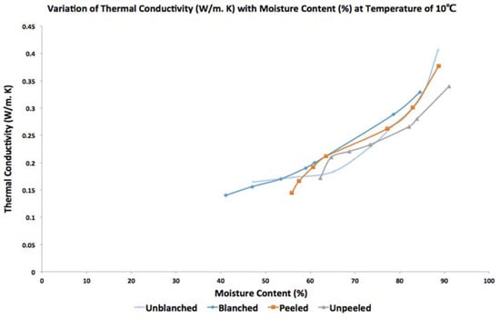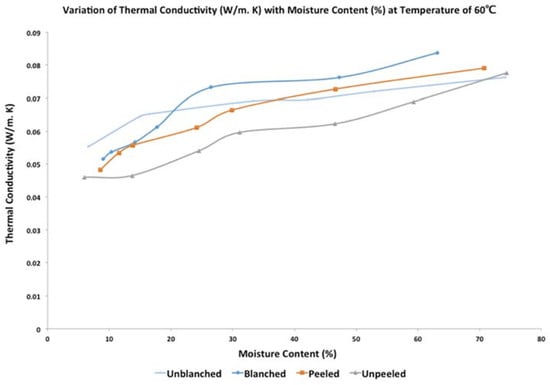 Our analysis revealed a significant link between moisture content and thermal conductivity. More precisely, as the moisture content declined during drying, a corresponding decrease in thermal conductivity was noted. Quantitatively, for unblanched ginger that initially had a moisture content of around 81% and a thermal conductivity of approximately 0.0553 , the thermal conductivity dropped to 0.0460 as drying progressed, and the moisture content fell to roughly 6.63%. This trend was consistently observed across all types of ginger evaluated—blanched, peeled, and unpeeled—underlining a robust relationship between moisture content and thermal conductivity in the drying process.