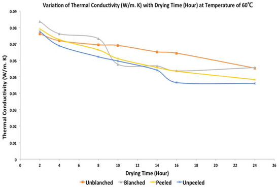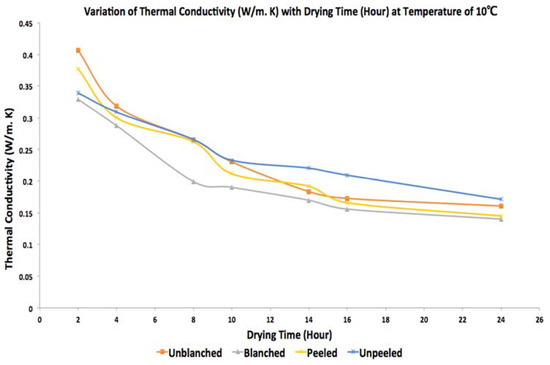 Figure 13 and Figure 14 depict a decreasing trend in the thermal conductivity of unblanched, blanched, peeled, and unpeeled ginger over time. The highest thermal conductivity is observed at the 2 h mark, significantly declining until the 24 h drying time. These trends are most notable at temperatures between 10 °C and 20 °C, with a marked decrease between 30 °C and 60 °C for the various ginger samples.