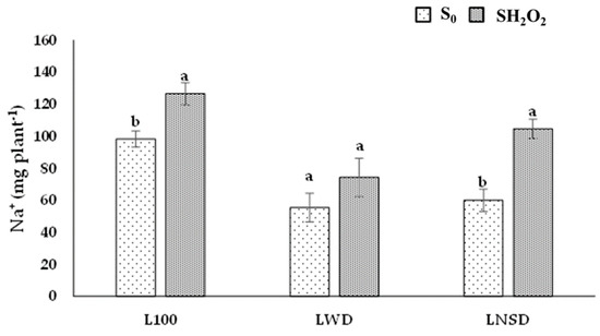 Interactions between fertigation treatments and H2O2 supply on Na+ leachate. L100 = raw leachate from C. lanatus, LWD: raw leachate from C. lanatus diluted with tap water until EC of 2.5 dS m−1; LNSD: raw leachate from C. lanatus diluted with standard nutrient solution until EC of 2.5 dS m−1 and H2O2 supply (S0 and = without H2O2 and SH2O2 = with 2% H2O2). Different lowercase letters indicate significant differences between treatments.