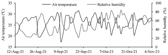 The temperature and relative humidity of the air were recorded daily (Figure 1) by using a thermo-hygrometer placed inside the greenhouse. The minimum and maximum air temperatures were 19.0 and 37.6 °C, respectively, and the relative humidity ranged from 23.5 to 86.6%.