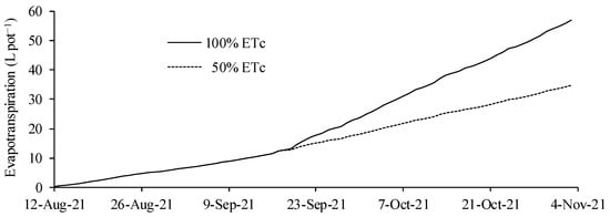 The total water consumption was found to be 57.0 and 34.7 L for the cultivated plants, with replacements of 100 and 50% ETc, respectively (Figure 2). Up to 36 DAE, all hybrids received water replacement equivalent to 100% of ETc. From that date, the plants in the 50% ETc treatment began to receive less water, reducing the matric potential of the soil and triggering the effects that will be presented later [22,23]. In the treatment of 100% of ETc, it is verified that the slope of the curve is increased from 36 DAE. This result is a function of the increase in the leaf area index and consequent increase in the transpiration component [24].