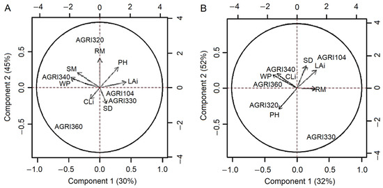 Biplot of the first (x-axis) and second (y-axis) principal component referring to the five corn hybrids cultivated with the replacements of 100% (A) and 50% (B) of the crop evapotranspiration. SD: stem diameter; PH: plant height; LAi: leaf area index; CLi: chlorophyll index; SM: shoot dry mass; RM: root dry mass; WP: water productivity.