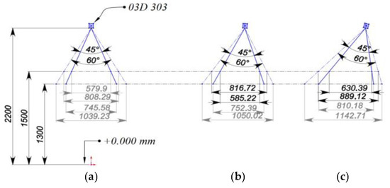 The height and inclination angle of the three-dimensional sensor are based on four parameters: cow height, cow length, minimum working distance between the camera and the object, and the camera’s allowable error. The height of the animals under study ranged between 1300 mm and 1500 mm, the minimum working distance of the camera between the surface and the object under study was 300 mm. The signal from the identification antenna of the animal’s RFID tag triggered the three-dimensional image production.