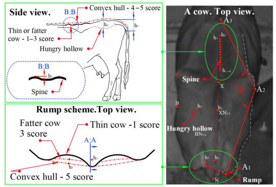 Table 2 shows the two approaches to BCS evaluation, the upper part was used for BCS evaluation by the expert panel, the lower part of the table was used for automatic evaluation. The numerical values were determined manually by analyzing the resulting field database of animals. The numerical characteristics are the average values for each body condition score and are relevant for the black-motley and the Holstein black-motley breeds raised in Central Russia. For other breeds, the numerical characteristics described in