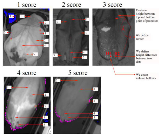 Figure 5 shows three-dimensional images converted into the black-and-white format. The pictures show animals with a body condition score from 1 to 5 on a 5-point scale and an explanation of which area of the animal’s back is manipulated by the algorithm.