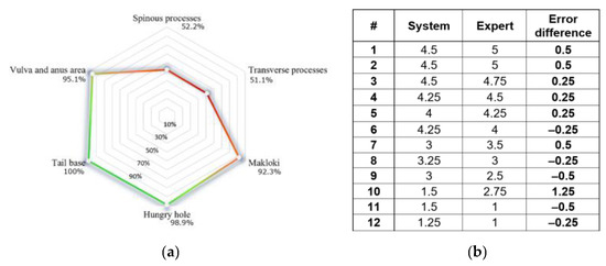 Figure 7 show that the developed method can estimate the tail base area with the 100% accuracy. The hunger hollow is determined with a 98.9% accuracy and the vulva and anus area with a 95.10% probability. Protruding vertebrae—namely, spinous processes and transverse processes—are evaluated with a 52.20% and a 51.10% accuracy. The accuracy of 50% was explained by the fact that according to