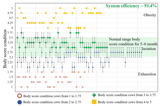 Figure 7 shows that animals with a condition score of 2.5 to 3.5 at 5–6 months are healthy. The developed system gives reasons to divide the animals into three groups, confirming their physiological status: normal range body condition, exhaustion, and obesity. In this case, it is worth bearing in mind that the system has an accuracy of 93.4%. Then, in this study, 4 animals with a body condition score of 3.75, and 15 animals with a body condition score of 2.5 had a 6.6% probability of belonging to another physiological status group. This is due to the fact that the system was wrong by 0.25. Errors caused by other nutritional scores are not critical, as technologically, an animal is either healthy and does not require any manipulation even though the system gave a nutritional score of 3 ± 0.25, or it has exhaustion/obesity, which requires manipulation of the animal to improve its physiological status.