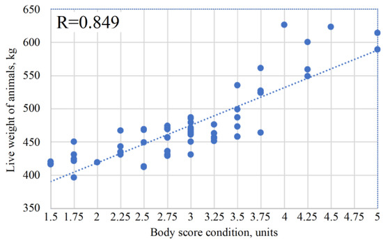 The Pearson correlation tool was chosen to determine if there was a relationship between the live weight and body condition score of the cows under study, as the data obtained have a normal distribution. Discussion of the data shows that part of the values on the scale from 4 BCS points to 5 BCS points and a live weight above 525 kg have a chaotic distribution. The Pearson correlation is R = 0.849, which does not guarantee 100% correlation. This is explained by the following: the live weight of animals consists of basic parameters—the amount of dirt accumulated on the animal, the amount of feed eaten, and the month of pregnancy. Additionally, live weight was obtained using the Klüver–Strauch method [