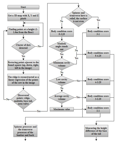 Figure 9 starts with a three-dimensional map containing X, Y and Z coordinates of each pixel, and then searches for points at height (in the range of 1–1.6 m from the floor). When a cluster of points is detected, the algorithm determines the location of the main features: the spine, the hips, the tail head, and the vulva region. The topography of the spinous and transverse processes relief was then determined and the initial BCS value was determined.