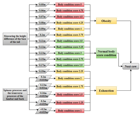 Figure 10, for the initial BCS of 2.25–5 with no scalloping of the spinous and transverse processors and a low depression, the difference in tail head height was measured. For the primary BCS values in the range 1–3 with spinous and transverse processes in relief and a large hollow volume, the spinous and transverse processes of the lumbar and dorsum were measured. Depending on the results, the algorithm outputs had three evaluation options—‘normal BCS’, ‘obesity’, ‘exhaustion’.